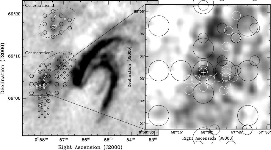 Figure 8: Observed positions of the CO survey superposed onto a map of H I emission from Yun et al. (1994) ( left) and from Adler & Westpfahl (1996) ( right). The white cross on the right panel shows the position of the complex. The circles represent the beams of the IRAM 30 m (white) and the Kitt Peak telescope (black; large circles 3 mm; small circles 1 mm). The dashed ellipses show the locations of Concentration I and Concentration II. |