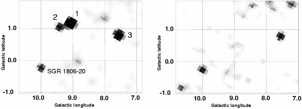 In Fig. 3 we compare the hard X-ray flux measured with INTEGRAL with the level of activity from SGR 1806-20 as a function of time. This is indicated by the number of bursts detected by the Interplanetary Network (IPN). The source was quiescent during the first INTEGRAL observing period and moderately active in the two following periods. The last INTEGRAL observations, in which a harder and brighter persistent emission was detected, took place after the strong reactivation of the Summer 2004. SGR 1806-20 was still particularly active in September-October 2004 (Mereghetti et al. 2004a; Golenetski et al. 2004).