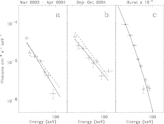 Figure 2: IBIS/ISGRI spectra of SGR 1806-20: a) persistent emission March 2003-Apr. 2004, b) persistent emission Sept.-Oct. 2004, c) one burst (scaled down by a factor 104). The solid lines are the best fits (power laws in a) and b), thermal bremsstrahlung in c)). The dashed lines indicate the extrapolation of power-law spectra measured in the 1-10 keV range with XMM-Newton (Mereghetti et al. 2004b). |