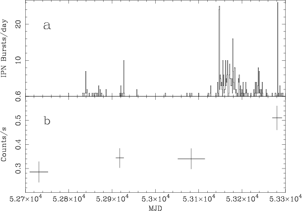 Figure 3: a) histogram of number of bursts per day detected by the third Interplanetary Network (IPN). This histogram includes mostly those bursts with fluences larger than 10-7 erg cm-2 and is not corrected for experiment duty cycles and source visibility. It therefore represents only the trend of the burst rate and not its true value. b) Count rate in the 20-60 keV range. The horizontal error bars indicate the time spanned by the (non continuous) observations. |