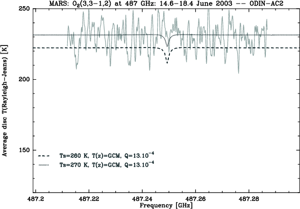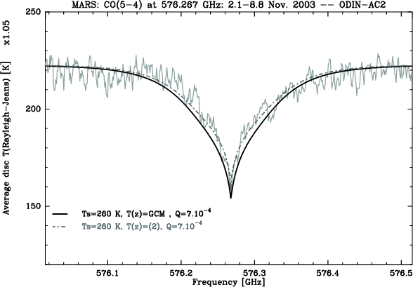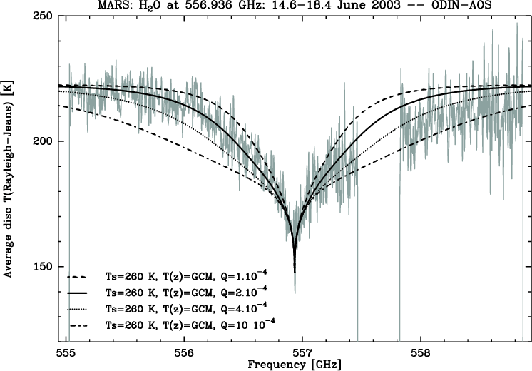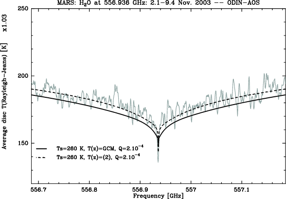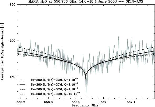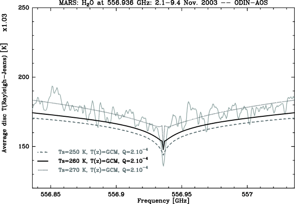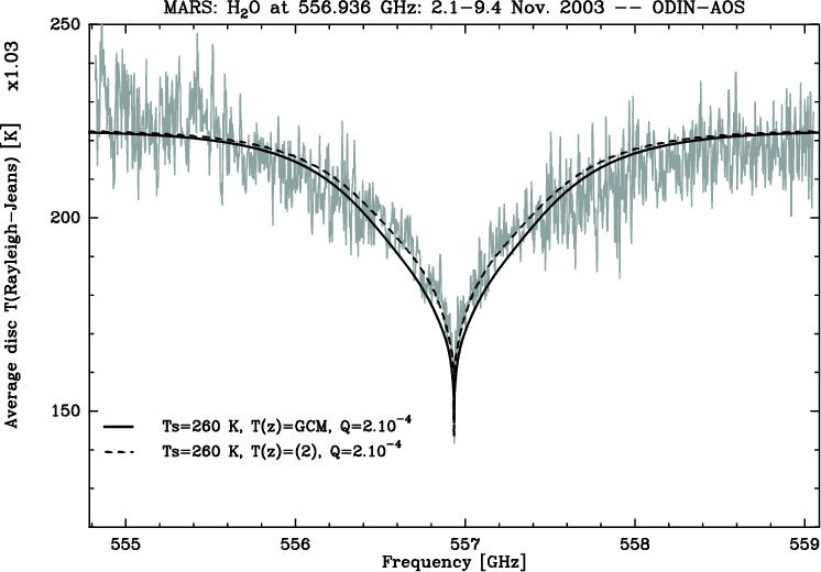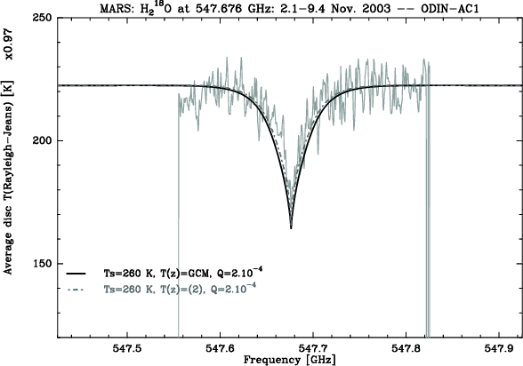 The observing scheme we used removed most of the ripple pattern, and provided a smooth baseline and a wide frequency coverage (3.9 and 4.2 GHz versus 0.6 GHz in the case of SWAS). This enables us to see the whole line up to the nearby continuum and provides better constraints on the global vertical temperature profile and water content of the Mars atmosphere at the time of the observations (southern hemisphere spring in June 2003 and southern hemisphere summer in November 2003; Table 2).