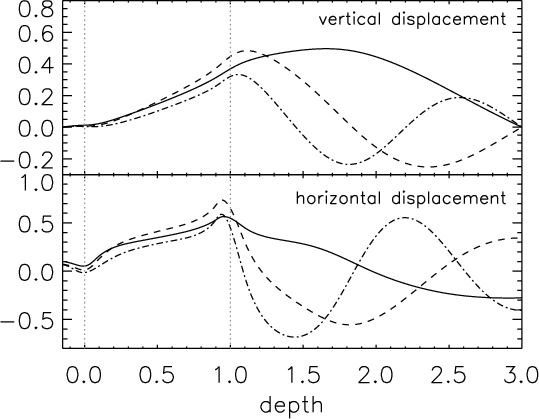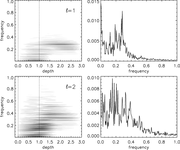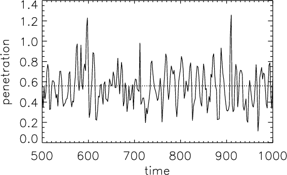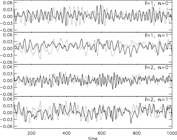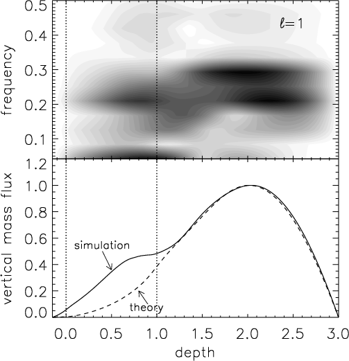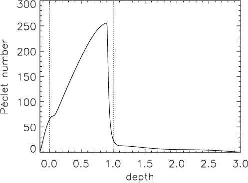 In the same way, the depth of the penetration in the stably stratified zone is without doubt a key parameter in the excitation mechanism by penetrative plumes. This penetration strongly depends on the local value of the Péclet number Pe: (i) large values of Pe mean that the advection is greater than the radiative diffusion such that the plume keeps its identity and is stopped very rapidly by the buoyancy braking, leading to a tiny penetration; (ii) small values of Pe mean that the plume thermalizes very rapidly with its surrounding and the buoyancy braking disappears, leading to a large penetration. It would then be interesting to further study the influence of the Péclet number on the mode amplitudes, by computing for example a grid of 2-D polytropic models with different indexes m3, in order to play with the Péclet number jump at the base of the convection zone (Eq. (6)). Likewise, the influence of the dimensionality; i.e. the differences between 2-D and 3-D also need be investigated.