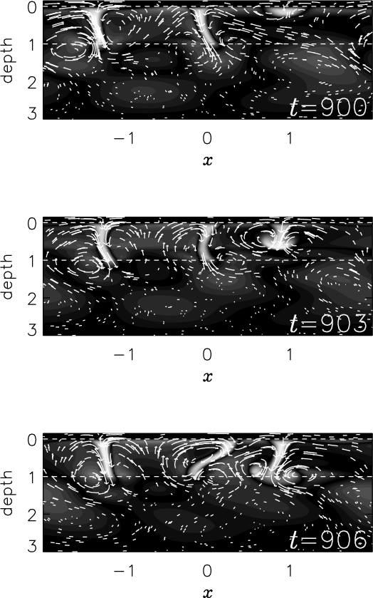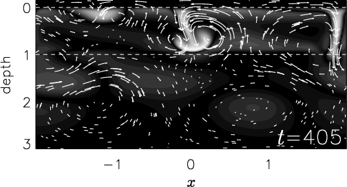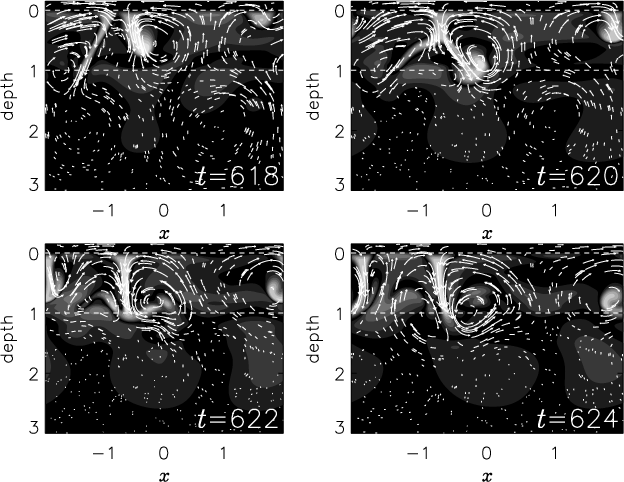 The most wide-spread excitation model is based on penetrative convection from neighboring convection zones. Strong downward plumes are known to extend a substantial distance into the adjacent stable zones so that internal gravity waves can be randomly generated. 2-D and 3-D direct numerical simulations of superposed stable and unstable layers have confirmed this scenario since gravity-like waves have been well observed in stable regions (Hurlburt et al. 1986, 1994; Brandenburg et al. 1996; Brummell et al. 2002).