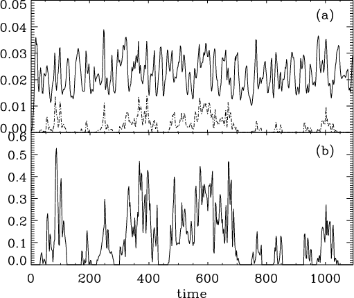 Figure 18: a) Time evolution of the total kinetic energy (solid line) embedded in the simulation, with its component which is only due to g-modes (dot-dashed line); b) ratio between the two. |