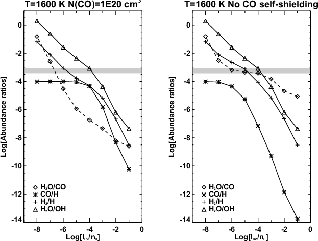 Effect of CO self-shielding on abundance ratios. The left panel shows the addition of a strong self-shielding on the chemistry, while the right panel is the same as the upper right panel in Fig. 7. As expected the changes happen only on the H2O/CO and CO/H ratios. The observed value of H2O/CO ( |