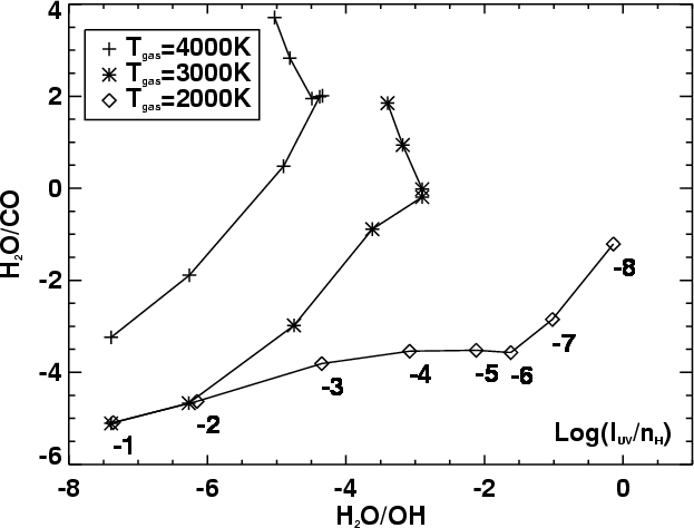 This figure shows the H2O/CO versus H2O/OH abundance ratio. The
