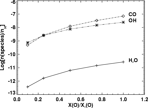 By pushing the dust grains beyond the dust sublimation radius, the radiation pressure will separate gas and dust. Segregation of the gas and dust results in an increase in elemental C/O ratio because the silicate grains, which contain 10-20% of the available oxygen, do not sublimate. The effect of an increase in the elemental C/O ratio above the solar value of 0.4 would be to lower the water and molecular oxygen abundance. In theory, the elemental abundances can be deduced from the study of the star's photospheric lines if it is not too embedded. Terzieva & Herbst (1998) discussed the different effects on the chemistry caused by variations in the C/O elemental abundance, but their study is limited to low temperature chemistry where elements can be depleted onto grains. Here we allow the oxygen's elemental abundance to vary from 0.1 to 1.0 times the nominal value listed in Table 6. The model results at steady-state are shown in Fig. 11. As expected, the relative abundance of CO, OH, and H2O diminish with decreasing oxygen elemental abundance. The rate of decrease is similar for the three species. Therefore, the relative abundances H2O/CO and H2O/OH are not significantly affected by changing the oxygen abundance. The simultaneous decrease in CO and H2O abundance with lower oxygen elemental abundance can be ascribed to the formation route of both molecules that are formed via the radial OH. This contrasts with the chemistry that occurs in quiescent molecular clouds where H2O is synthesized at a much lower rate than CO, which then results in a higher CO/H2O ratio as the oxygen elemental abundance decreases.