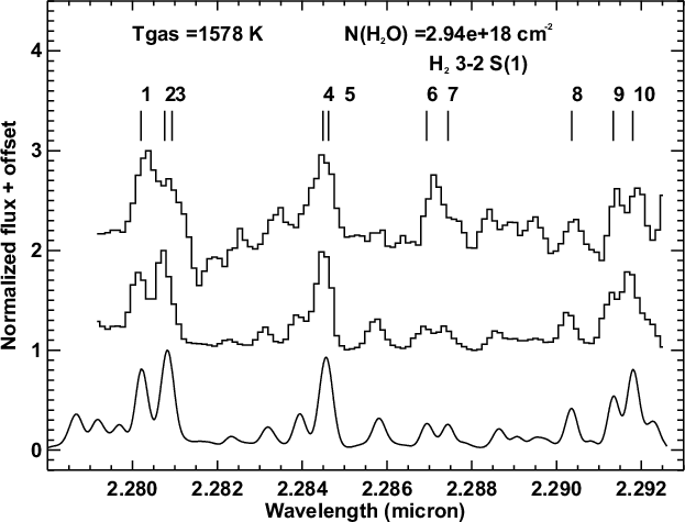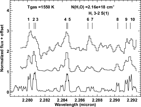 Highly excited water lines, which are absent in our atmosphere, are detected from the ground in the atmosphere of M dwarfs (see Allard et al. 2001, and references therein), Sunspots (Zobov et al. 2000), and in the disk around the low-mass young star SVS 13 (Carr et al. 2004). In the latter object, CO bandhead emission has also been detected.