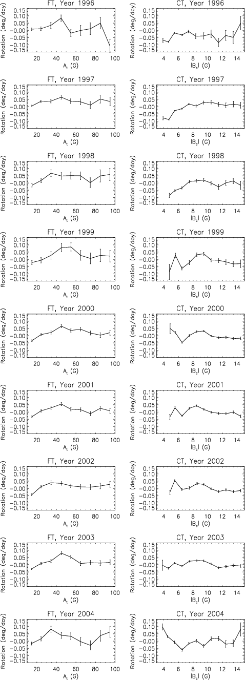 The CT equatorial rotation rate is larger at cycle maximum than at cycle minimum. However, the variation is far from monotonous from minimum to maximum, as it starts to decrease from cycle minimum to the middle of the rising phase (this was already seen by Meunier 1999), and then increases toward larger values at cycle maximum. The FT equatorial rate shows a similar variation at the beginning of the cycle, but the subsequent increase is smaller than for CT as shown in Fig. 2. This is confirmed by the equatorial rate values in Table 1. The variation until 1999 is however very well correlated between the two techniques.