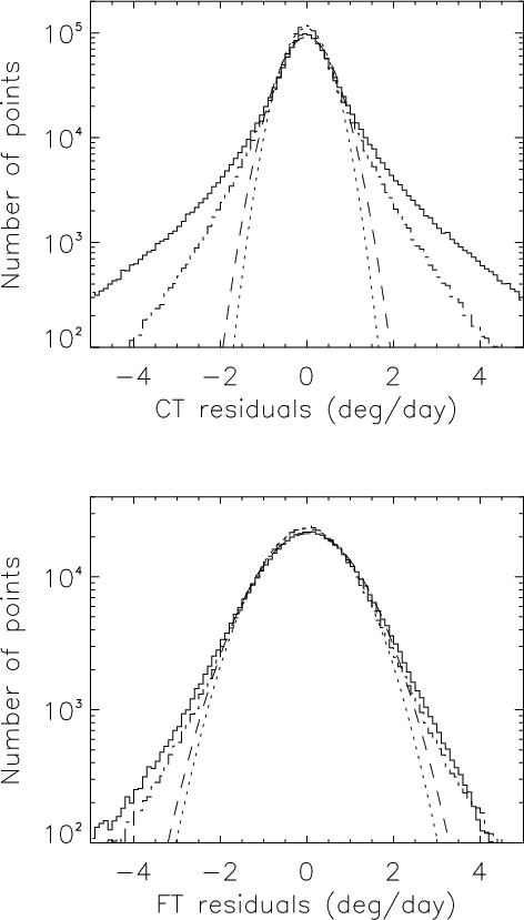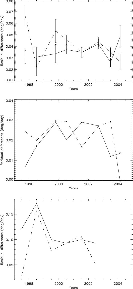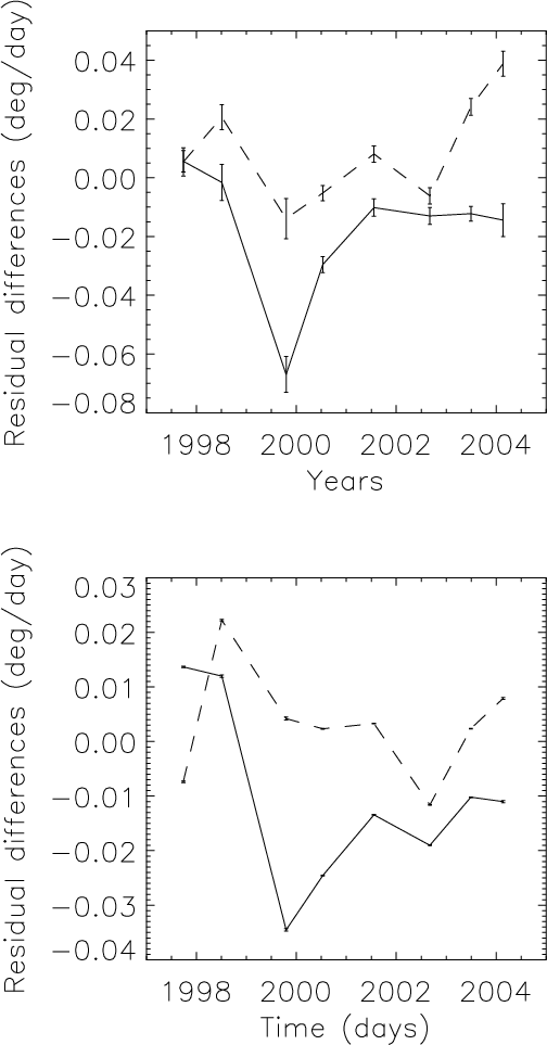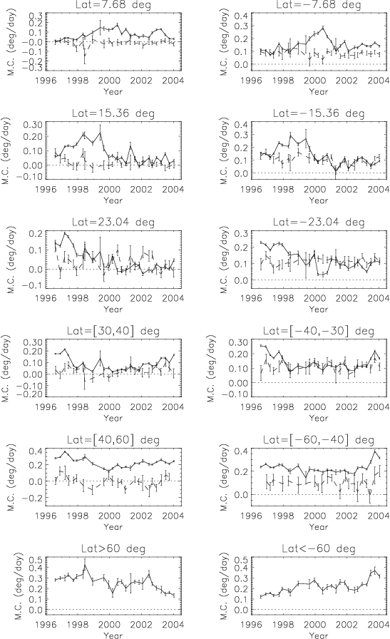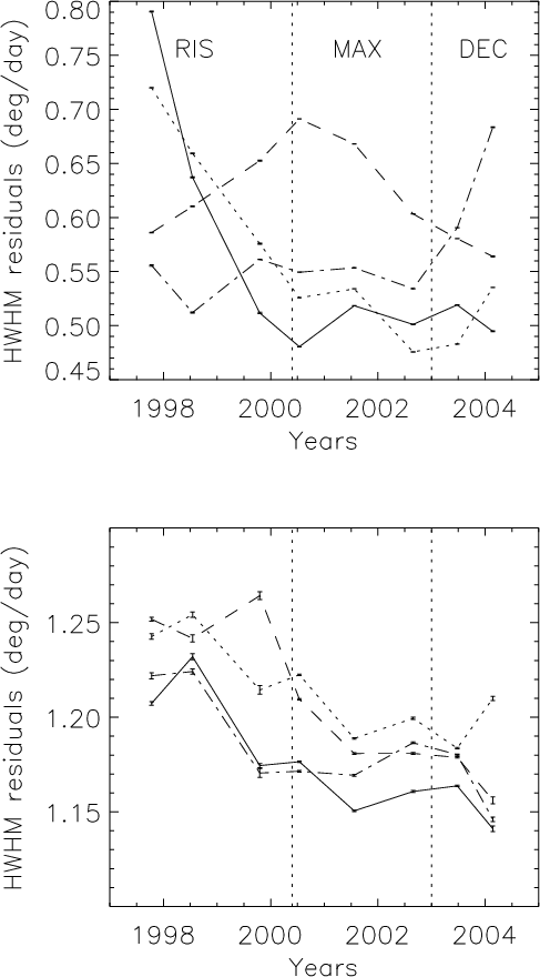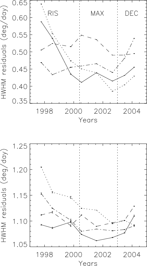 Figure 7 shows the HWHM of the residuals for both polarities in both hemispheres. For the CT method, leading polarity regions exhibit large HWHM at cycle minimum. The HWHM then decreases towards lower values by a factor of 2 during the maximum and declining phase. On the other hand, the following polarity starts with low values, which then increase during cycle maximum and the declining phase of the cycle. As a consequence the 2 categories of curves (leading and following) cross each other, just before the solar maximum. The Northern hemisphere is in advance by about 1 year compared to the Southern hemisphere. The rms values over the whole series of residuals show the same behavior although shifted in time by about 6 months to 1 year. The percentage of points in the tails compared to the core is well correlated with these curves. Therefore, large-scale flows exhibit large variations over the solar cycle, a large North-South asymmetry and large differences between polarities. At the end of the cycle the following polarity will become the leading polarity and vice-versa. So a cyclic behavior must be observed and this will have to be checked with a longer data set.
