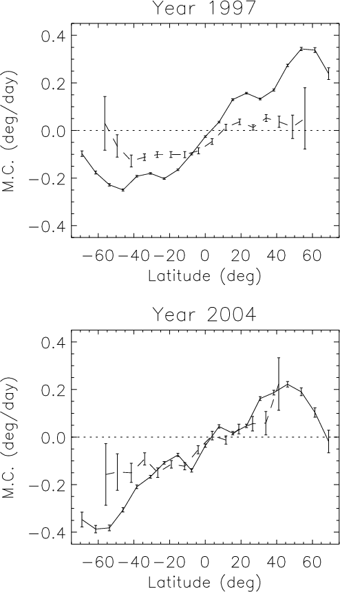Figure 8 shows the meridional circulation versus latitude for two years, in 1997