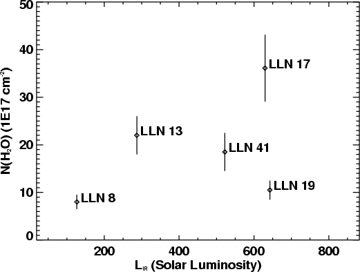 In summary, the simultaneous presence of large amount of water-rich CO ice, CH3OH ice, and OCN- ice toward LLN 17 and the non-detection in other objects are consistent with the idea that these species are formed by a combination of UV and thermal processing in the inner regions of the circumstellar envelope. The UV radiation can be generated by the interaction between the outflows and envelope, by the central source, or by a combination of both mechanisms. Another possibility is that CH3OH is first synthesized in the gas-phase, then condenses onto grains simultaneously with H2O in post-shocked regions.