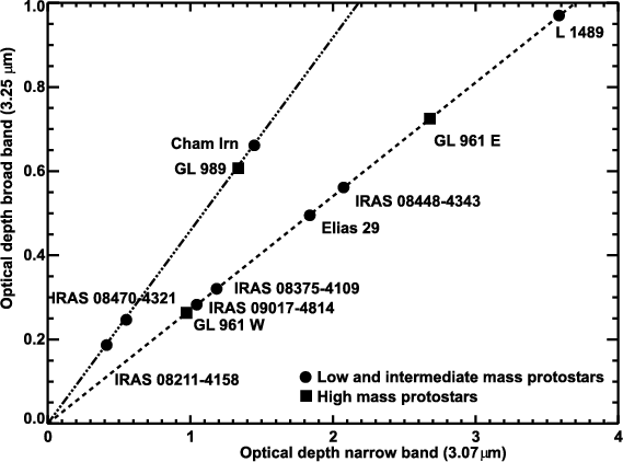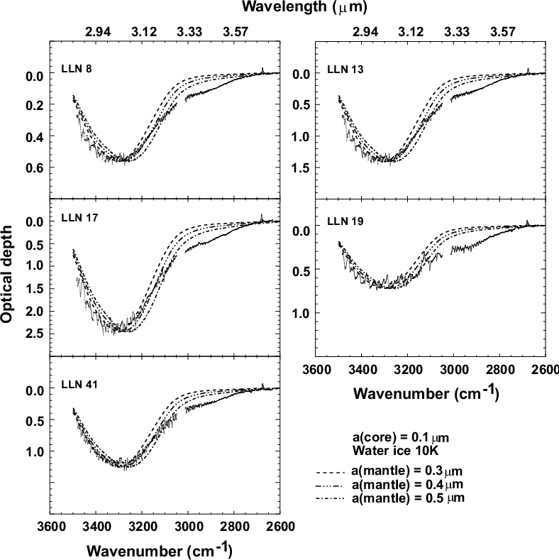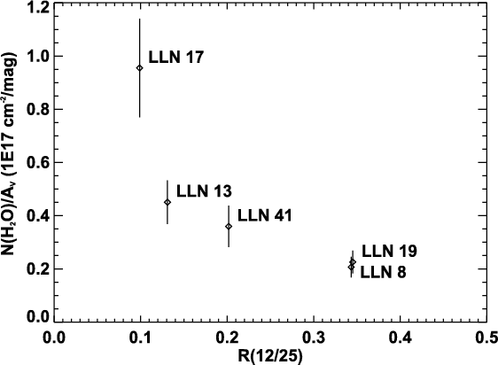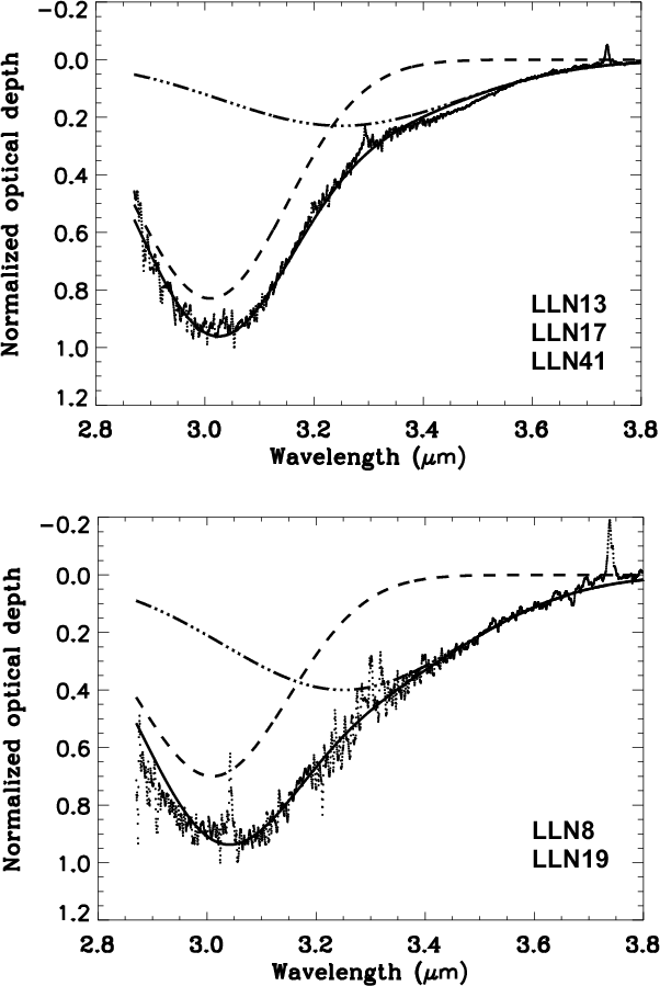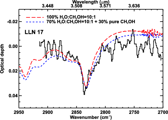 Another particularity of LLN 17 is that the water ice abundance with respect to H2 is the highest (see Fig. 18) in our sample. Methanol ice and OCN-are often detected in objects with high water ice abundance (van Broekhuizen et al. 2004; Dartois et al. 1999; Pontoppidan et al. 2003a).