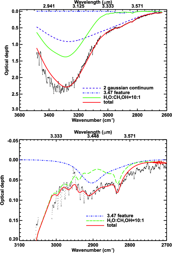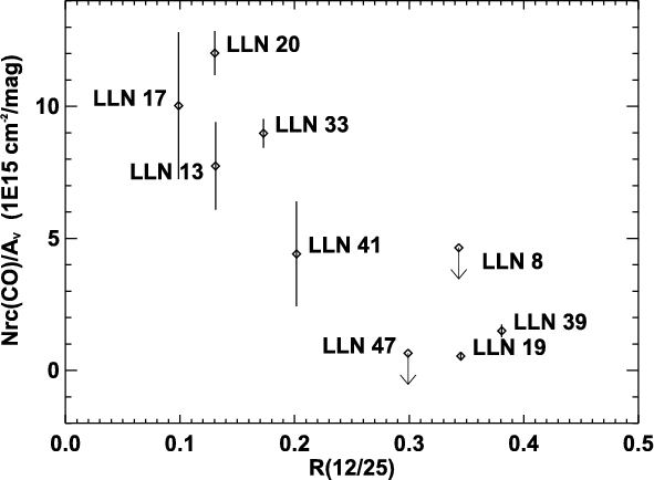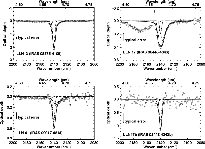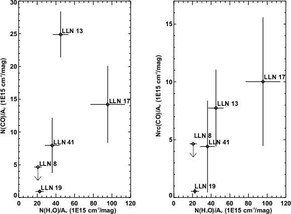 Finally, the presence of water-rich CO ice in LLN 17 and its absence in the companion object LLN 17b as seen in Fig. 9 reinforces the idea that the processing occurs in the vicinity of the central object (i.e. with a few thousand AU). The M-band spectrum of LLN 17b is too low to give meaningful upper limit on the amount of OCN-. The difference between LLN 17 and its companion suggests that external heating and/or UV processing by the other stars in the cluster play a minor role (see last column of Table 5).