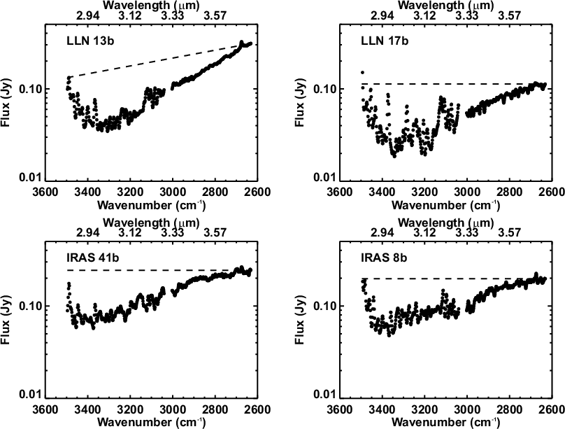 Figure 4: L-band spectra of the companion objects. The water ice absorption feature is seen in all spectra. The spectra are dominated by the spurious features due to a bad telluric transmission correction. The dashed lines indicate the adopted continuum used to estimate the water-ice optical depth. |