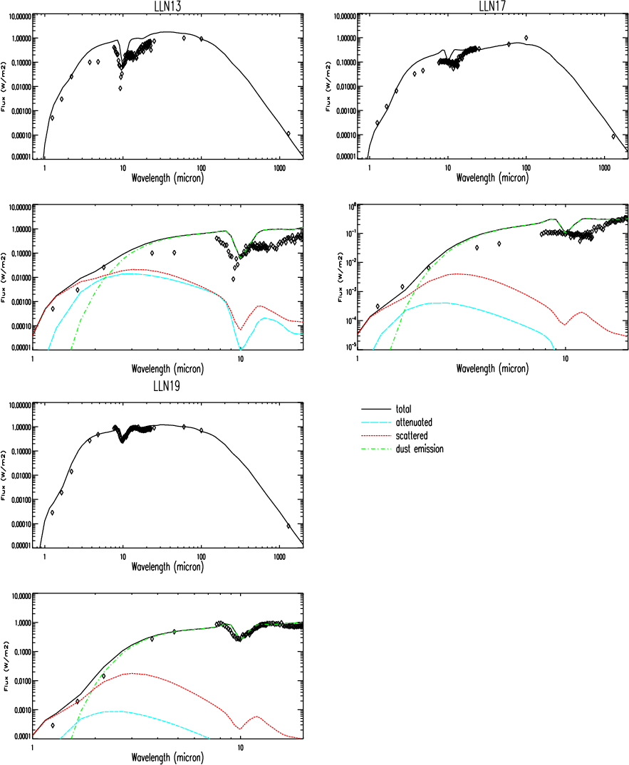 Figure 15: Fit to the SED of LLN 13, LLN 17 and LLN 19. The upper panels show the fit to the entire SED while the upper panels focus on the near to mid-infrared range. Also shown are the contribution by the extincted central object, the dust scattered light and the dust thermal emission. |