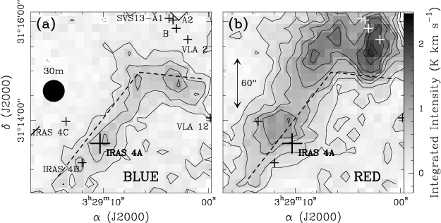 On a larger scale, the IRAS 4A outflow has a