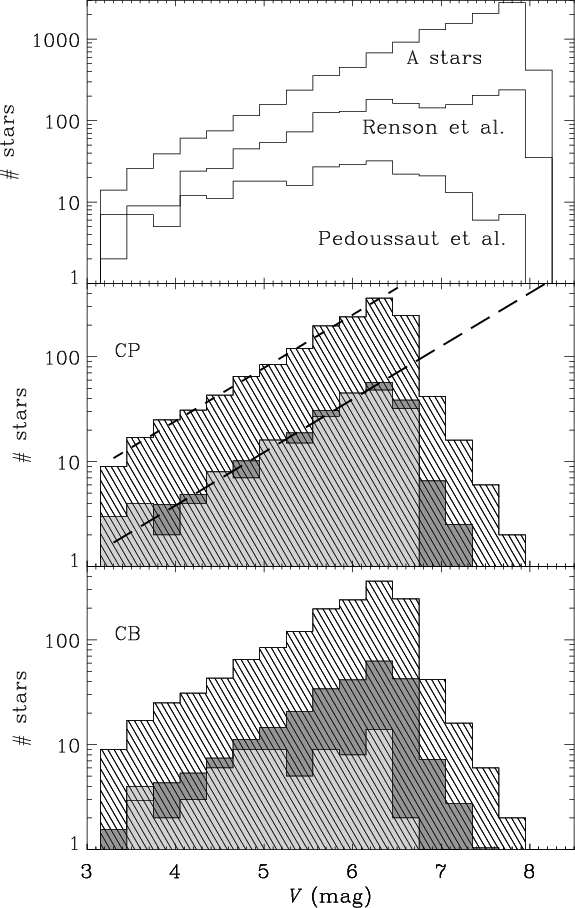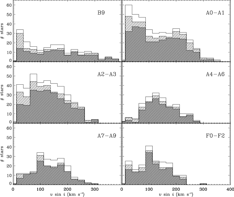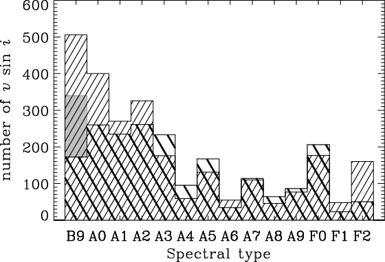 ebocki & Stawikowski's in the spectral type range B9-F2 is over-plotted (thin-dashed histogram).
