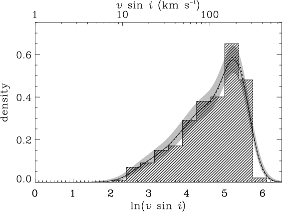 Distributions of rotational velocities for the observed subsamples: shaded histograms are the observed