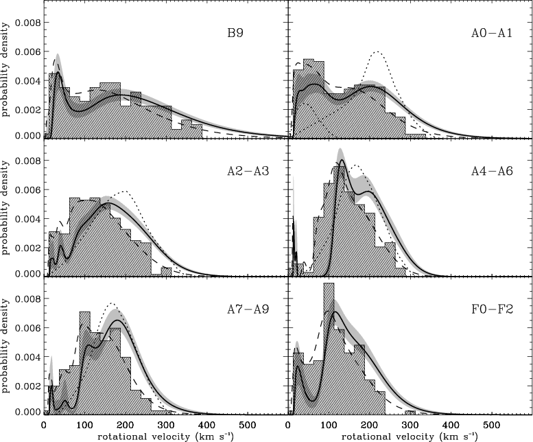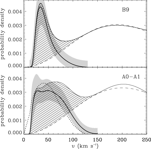 Figure 8: Slow rotators in B9 and A0-A1 type stars: the PDF of equatorial velocities v (solid line) are displayed. The fast rotator mode is fitted by a Maxwellian distribution (dashed line), and the slow rotator distribution is estimated as the excess compared to the Maxwellian distribution (hatched area). The difference between both distributions is plotted (bold solid line) together with its propagated variability band (gray strip). For the A0-A1 type stars, the distribution of chemically peculiar objects found by AM is overplotted (dotted line), normalized to represent the same number of stars. |