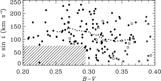 Projected rotational velocities as a function of the B-V index (from HIPPARCOS catalog) of the 150 "normal'' stars in the F0-F2 subgroup. Filled circles ( |