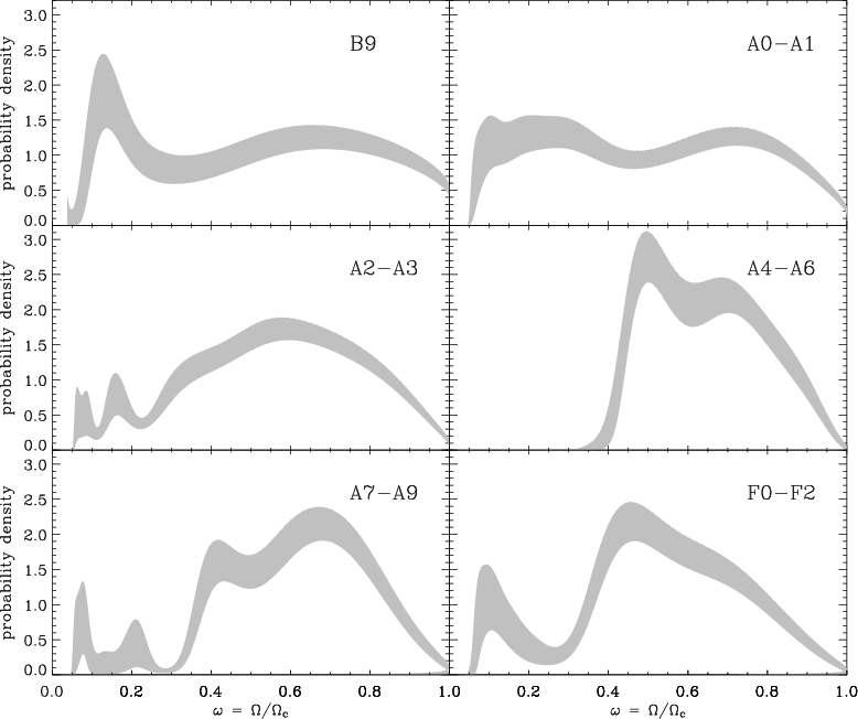 is the critical rotational velocity). Such distributions would probably be unimodal. On the other hand, the conjunction of a variety of rotational laws and rotational rates of coeval stars with the same mass in a single rotational distribution can have a multimodal aspect.