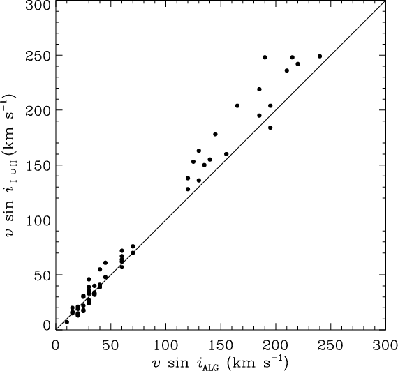 parameters are systematically lower than those from classical methods by roughly 15% among early stars up to spectral type A2, which is contrary to what is predicted by modern calculations of non-LTE rotationally broadened lines affected by GD (Frémat et al. 2005). The difference noted by Slettebak et al. (1975) drops to only a few percent for stars later than A2. Howarth (2004) re-examined Slettebak's et al.