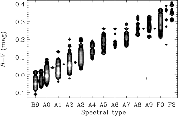 Equation (1) was used only for stars of late B spectral types, i.e. B9 and B9.5. The resulting I