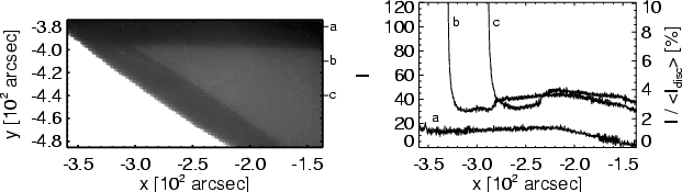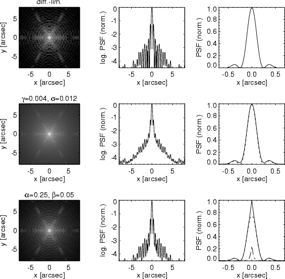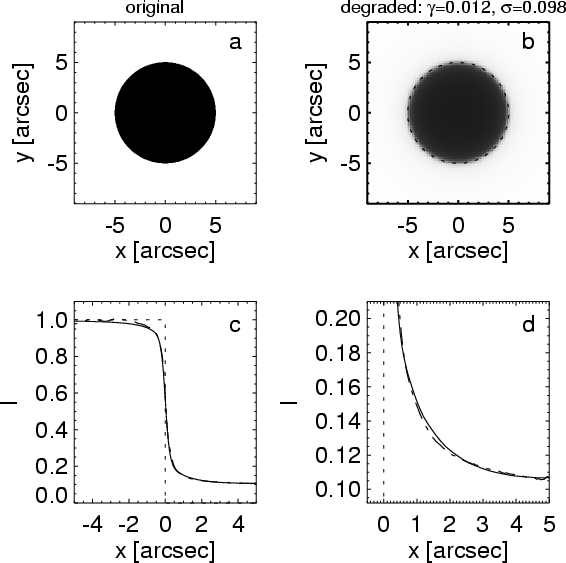 Constructing a realistic PSF is unfortunately a non-trivial task as often important contributions are hardly known. This is in particular true for stray-light produced inside an optical instrument (Mattig 1983). The best way to determine the properties of a telescope is, of course, direct measurement in the laboratory, but for space-borne instruments it is usually difficult to produce the same conditions as for the later operation. Another possibility of measuring the PSF is the observation of a partial solar eclipse. An illustrative example is the work by Deubner & Mattig (1975) who used observations of a partial eclipse in 1973. They fitted the observed intensity profile across the eclipse terminator with a combination of two Gaussians (cf. Levy 1971). Nordlund (1984) argued that the wings of the spread function give rise to uncertainties, which make it problematic to retrieve a definite analytical fit of the measured profile. He showed that instead of two Gaussians, a combination of two Lorentzians also produces a fit of comparable quality. The related uncertainties can have a fundamental impact on the derived intensity contrast. Nordlund proposes a correction factor of 1.5 with respect to the results of Deubner & Mattig. Beside these uncertainties, a fundamental problem remains as the fit of an observed terminator profile usually assumes a symmetric PSF/OTF, but can hardly account for asymmetric contributions. As we shall see in the case of SOT, a real PSF can have significant anisotropic components.