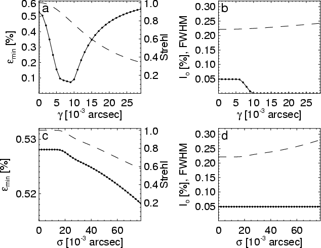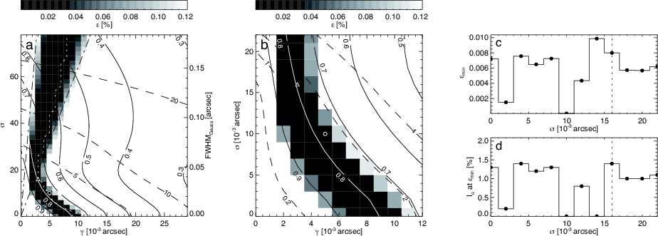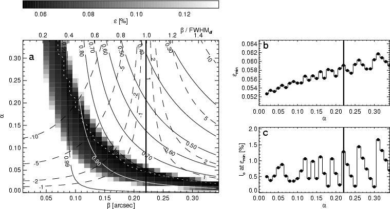 should be equal to or larger than the FWHM of the diffraction-limited PSF. Hence, the parameter domain left of the thick solid line in Fig. 9a, which marks