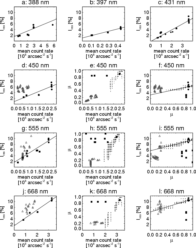 0.8. In view of the large variations - best seen in the residual intensities of eclipse images - and the dependence on the overall light level and position in the FOV, a range of PSFs should be considered instead of a single PSF per wavelength. The individual PSFs of that range allow then the determination of error margins for the quantity under investigation. Nevertheless, the stray-light contributions are found to be best matched with Voigt functions with the parameters