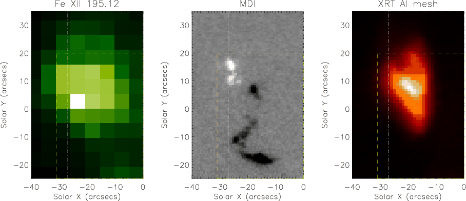 Figure 1: Images of the bright point as seen on 13 April 2007. Left to right: EIT (22:00:11 UT), MDI (22:01:01 UT) and XRT (22:01:05 UT). The outlined dashed box is the FOV as shown in Fig. 2, while the dot-dashed box is the region shown in Fig. 3. |