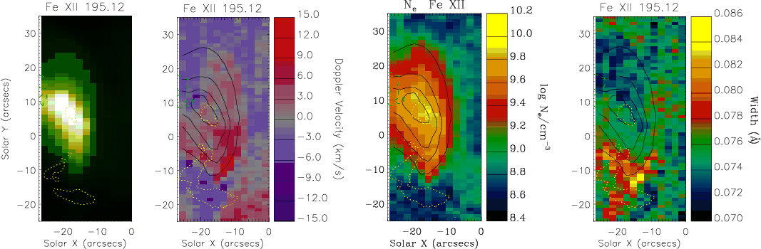 who found, with EUNIS observations, Doppler shifts ranging from -14 to +14 km s-1 in Mg IX 368.1 Å, and from -26 to +35 km s-1 in the