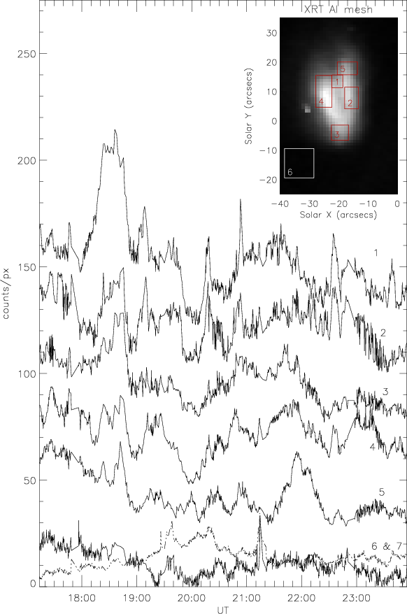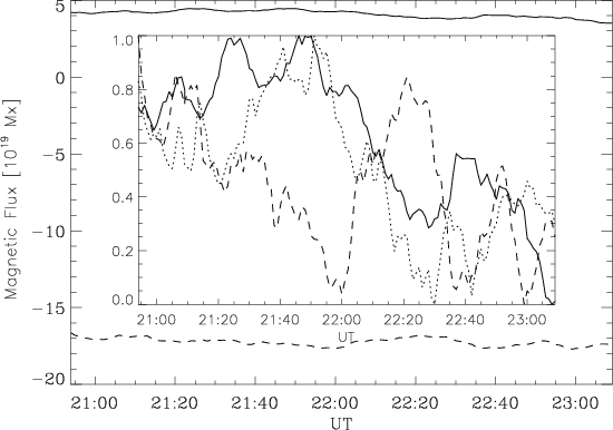 We performed a correlation analysis to find out if there is any relationship between the XRT light curve and the variations in the integrated positive and negative magnetic fluxes from the BP (shown in Fig. 4). Flux emergence and cancellation are both known to play a role in coronal heating (Priest et al. 1994; von Rekowski et al. 2006b; Archontis et al. 2005; Low 1996), and so we wished to investigate whether this relationship could be observationally confirmed, with changes in the BP magnetic flux triggering X-ray brightenings.