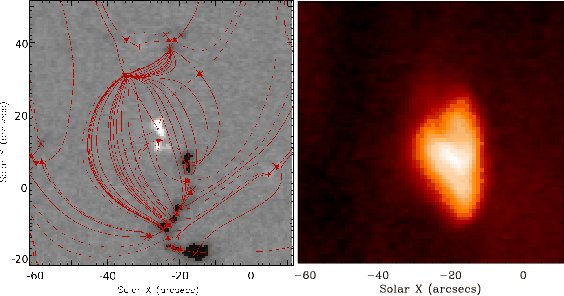 In a recent loop study, Aulanier et al. (2007) showed that slip reconnection should be considered. There is evidence of reconnection here (and in real life it probably is slip reconnection), but unfortunately, given the scale of the loops in the present data and the spatial resolution of the data, we are unable to comment on its importance here. In our reconstruction of the field lines we are looking at real magnetic nulls and separatrix surfaces, rather than quasi-separatrix layers where slip reconnection occurs. Also, the limitations of the modelling technique mean that we are unable to use our potential field extrapolation to try to estimate a realistic reconnection rate.