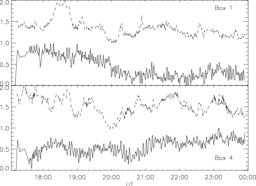 Figure 8: Normalised light curves from Ca II H (solid curve) compared with the corresponding XRT light curves (dashed curve), for two of the boxes in the Fig. 7. |