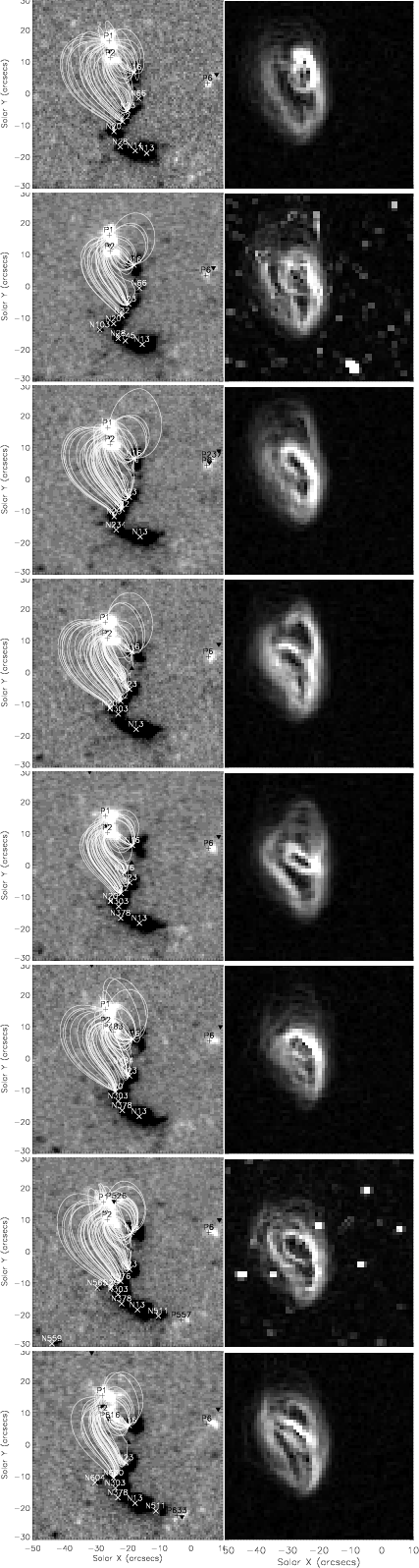 Recently Otsuji et al. (2007) with Hinode observations and previously de Wijn et al. (2005) and Sánchez Almeida et al. (2004) with ground-based observations showed that brightenings in Ca II images are related to the concentration of magnetic field as can also be seen by comparison of our MDI and Ca II data. We show in Fig. 11 the extrapolated field-lines obtained from the MDI data compared to the brightenings in the Ca II images. Each foot-point patch in the MDI data comprises several brightenings when viewed with the higher-resolution Ca II images. The left panel shows how the northern P1 polarity connects to the negative flux patches, while the right panel shows the connections of the southern P2 pole. P1 is connected with five negative patches while P2 is connected with three sources. The difference between the loop sizes from P1 and P2 is because P2 is closer than P1 to the negative sources. This shows an excellent correspondence between the footpoints of the extrapolated field-lines and the Ca II BPs.
