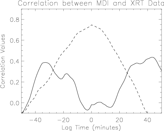 Given the correlation of the positive BP magnetic flux with the XRT light-curve (Fig. 9), we wished to determine if there was any time lag between peaks in the two datasets, possibly indicating how long it takes for the effects of flux emergence/cancellation to show up as brightenings in X-rays.
