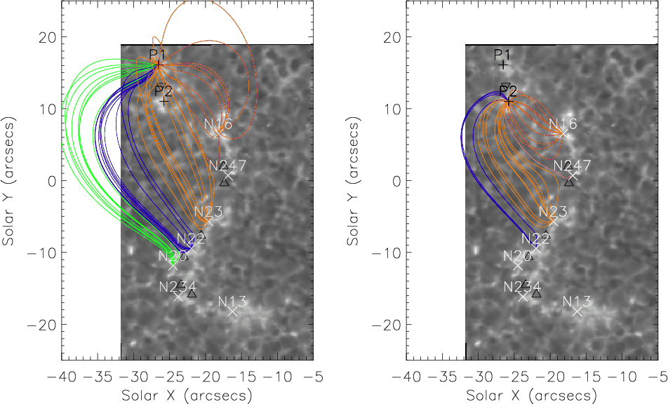 Figure 11: Ca II images at 21:37 UT with the magnetic field lines overplotted. In the left panel, the field-lines originate in the northern positive polarity, with different colours for the different foot-points. In the right panel, the field lines originate in the more southerly positive pole. There is a correspondence between the foot-points and the small bright points (see the third panel in Fig. 9 for the corresponding XRT image). |